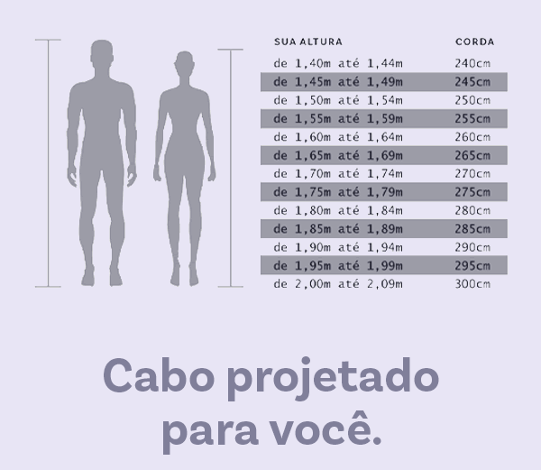 | Após muitos estudos e testes conseguimos chegar à espessura ideal do cabo de aço, tanto para antes do Double Under, quanto para quem já se encontra em um estágio mais avançado. Você também não precisará se preocupar com o comprimento do cabo, seguindo parâmetros internacionais enviaremos para você uma Skyrope com o tamanho exato para sua altura. |